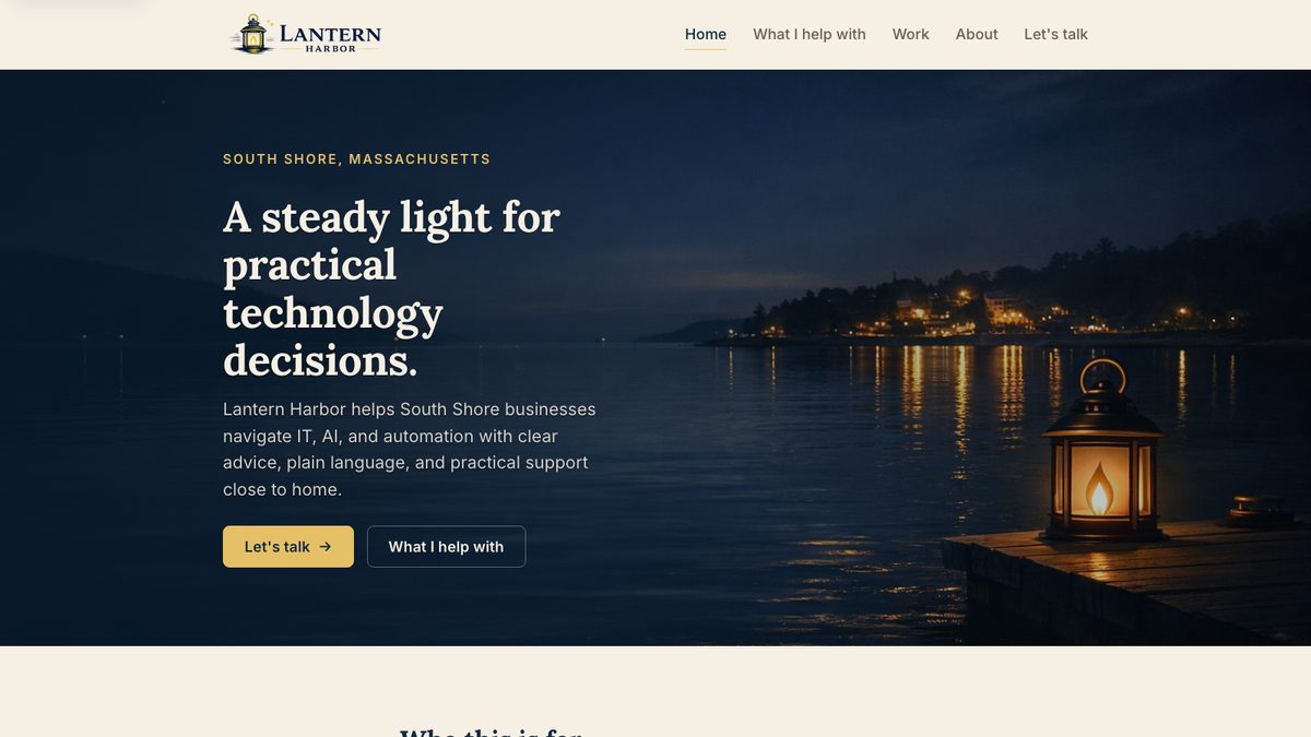 - Typography and color palette derived from the Lantern Harbor logo — Lora headings, Inter body, harbor navy and warm gold throughout