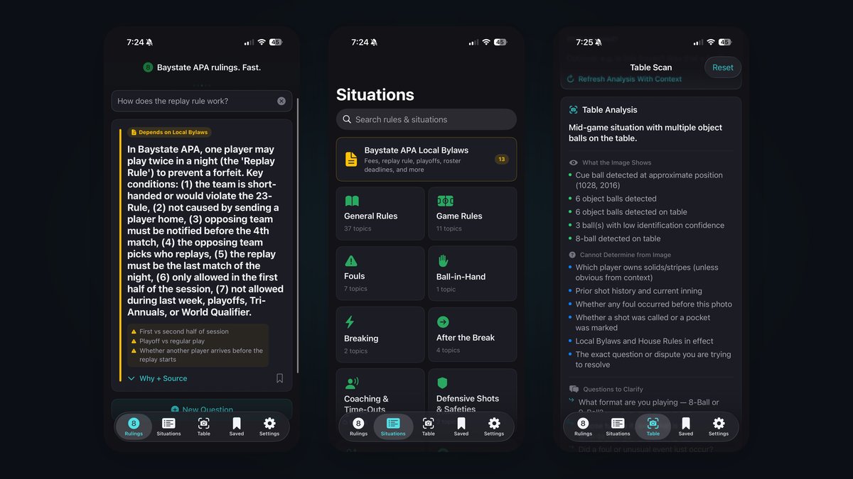 A native iOS app for league players and captains mid-match — answers Baystate APA pool rules questions in plain English, with structured rulings grounded in both the national APA manual and Baystate's local bylaws.